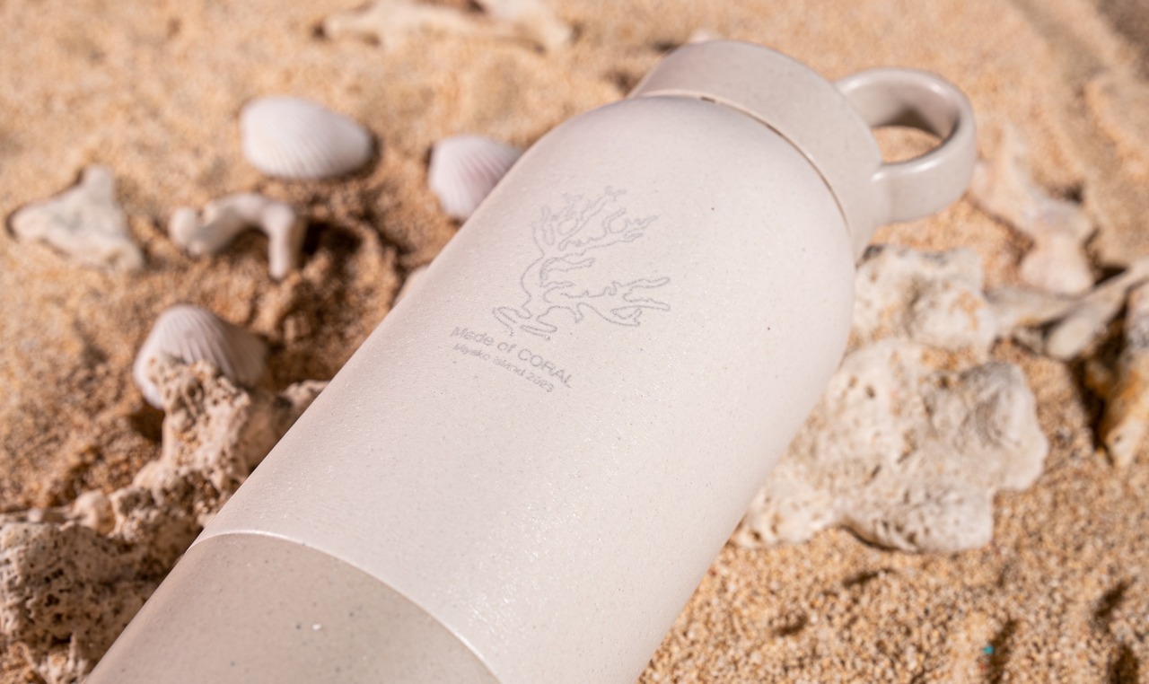 サンゴ礁と宮古島の美しい海を守るため、アサヒユウアスは、共創パートナーであるハヤシコーポレーションと、サンゴから作った「海のマイボトル」を共同開発しました。